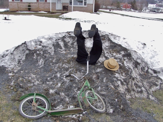 To lighten the mood, local resident Tom Grotting decided to pull a prank. He soaked a pair of jeans in water and then hung them outside. As they were freezing, he shaped the pants to look like a person was wearing them and then placed them in public locations around his neighborhood.